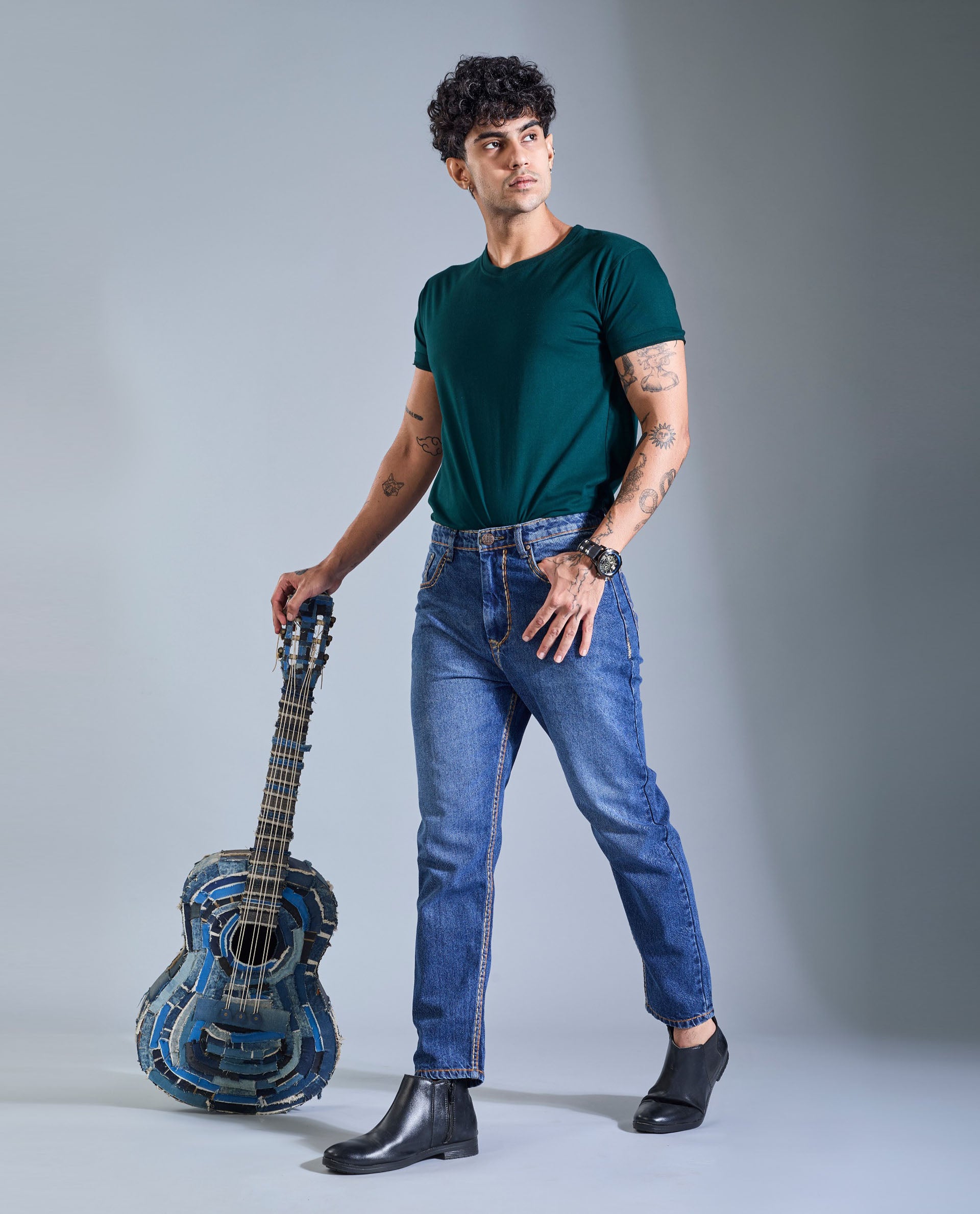 Crafted in a classic mid-blue wash, these jeans feature a neat, minimal fade that adds character without looking overdone. The front view highlights a smooth finish with subtle whiskering, reinforced seams, and a neatly stitched coin pocket for added functionality.