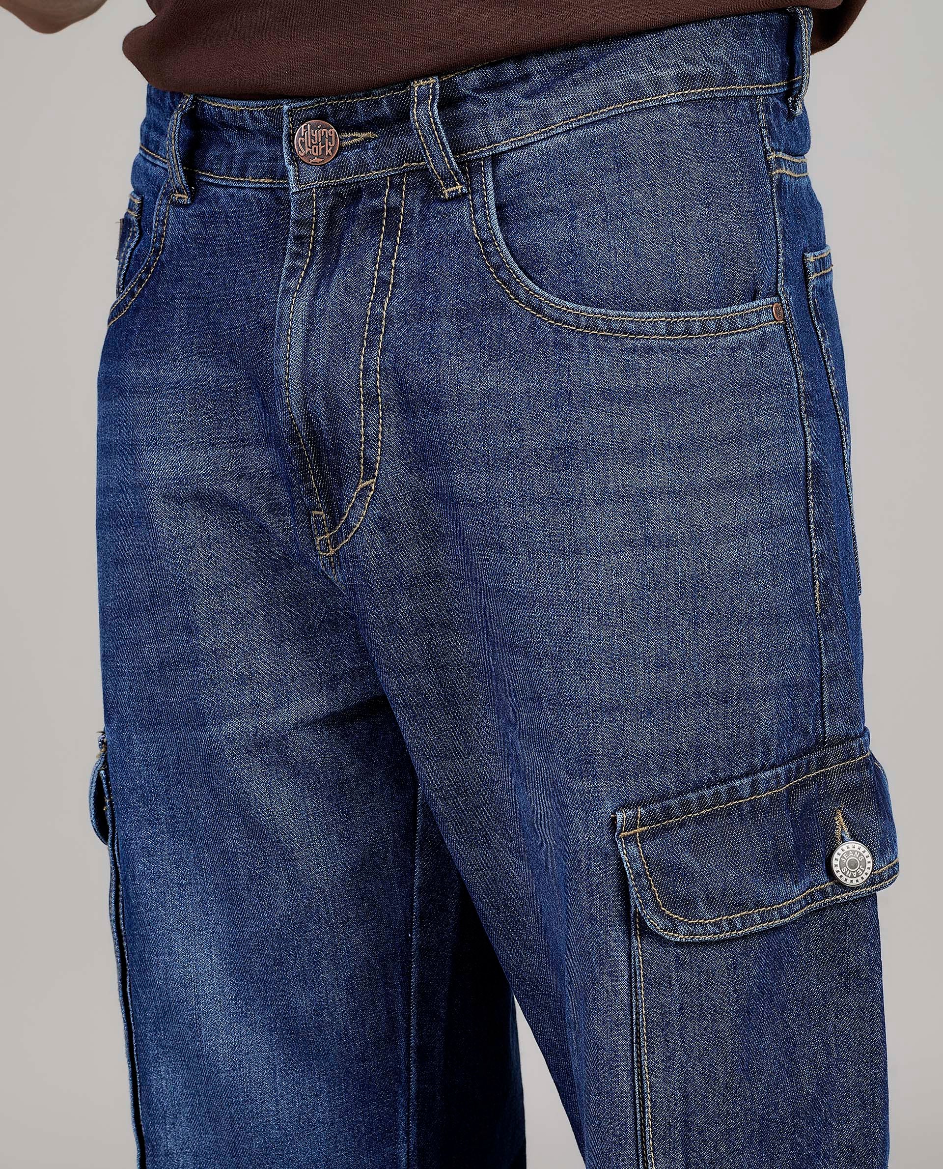 Crafted in a rich dark blue wash, these cargo jeans feature multiple utility pockets on the sides with flap closures, adding a rugged, street-ready edge to your look. The loose-fit silhouette ensures maximum comfort and mobility, while the sturdy denim fabric guarantees durability for everyday wear.