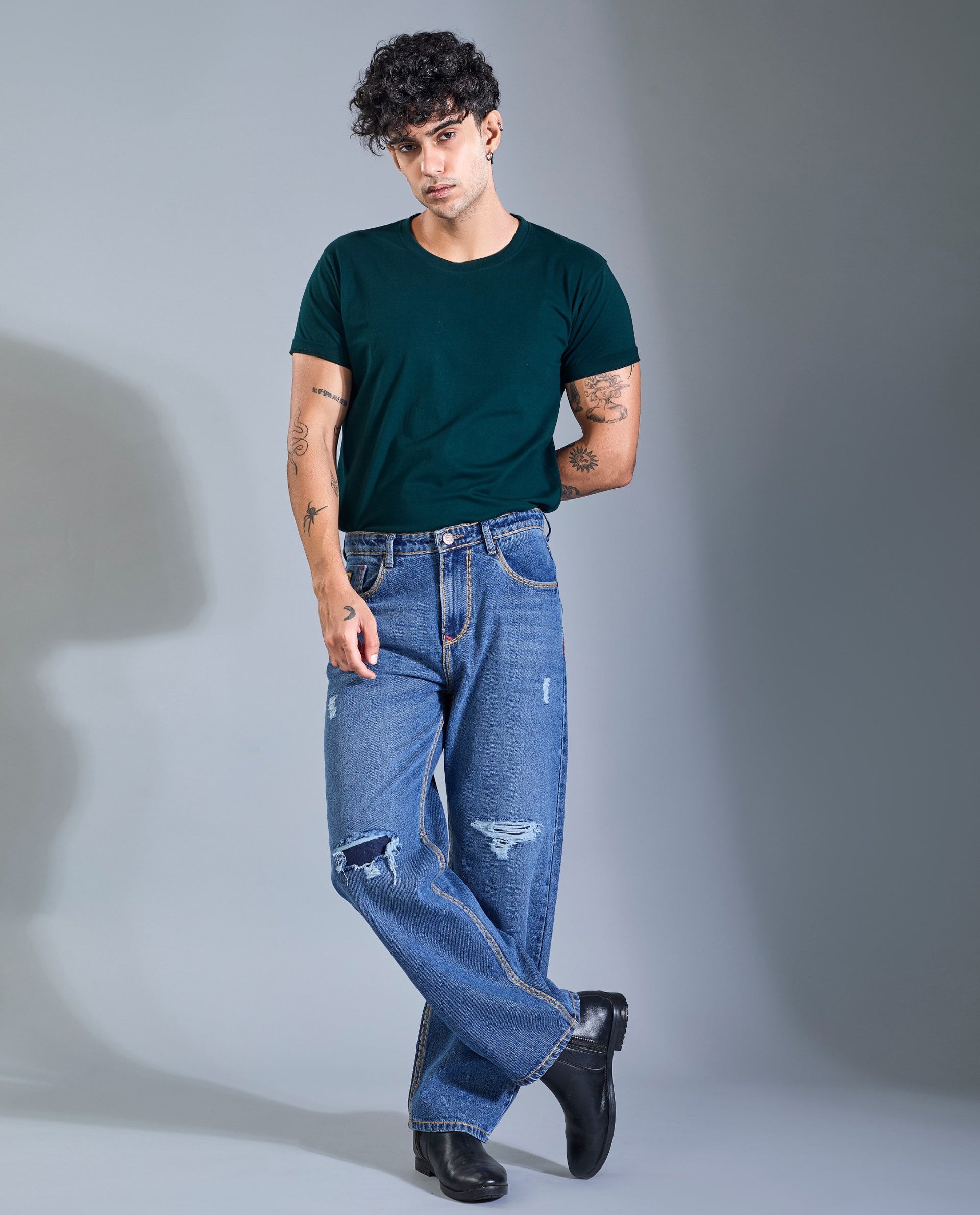 Made in a classic mid-blue wash, these jeans stand out with their bold, high-definition contrast stitching, which is the signature highlight of the design. The heavy-duty stitch work runs across the waistband, pockets, seams, and hem, delivering both visual appeal and long-lasting strength. Each stitch is precisely finished to maintain structure while enhancing the rugged denim aesthetic.