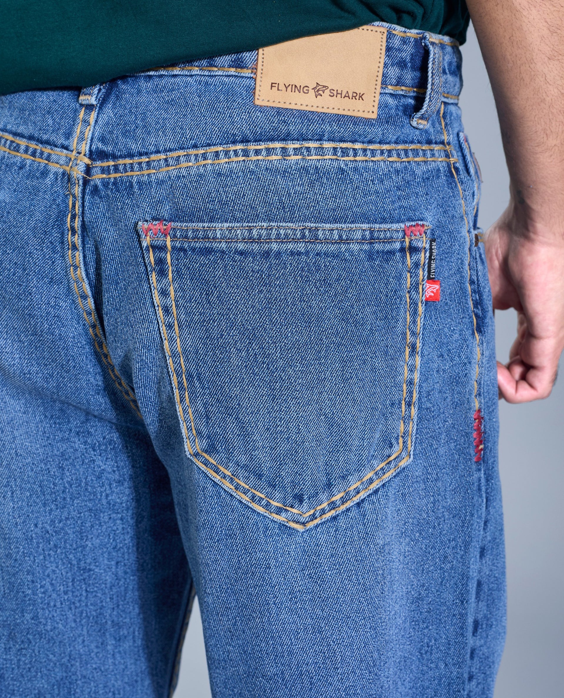 At the back, structured rear pockets with double-line stitch detailing, a signature Flying Shark logo tab, and a premium branded leatherette waistband patch complete the look with authenticity and premium finish.